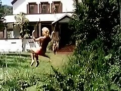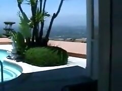 Cute Sarah takes on two lucky guys by the swinning pool.