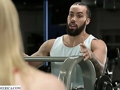 Petite blonde Anya Olsen works out on some big black cock at they gym